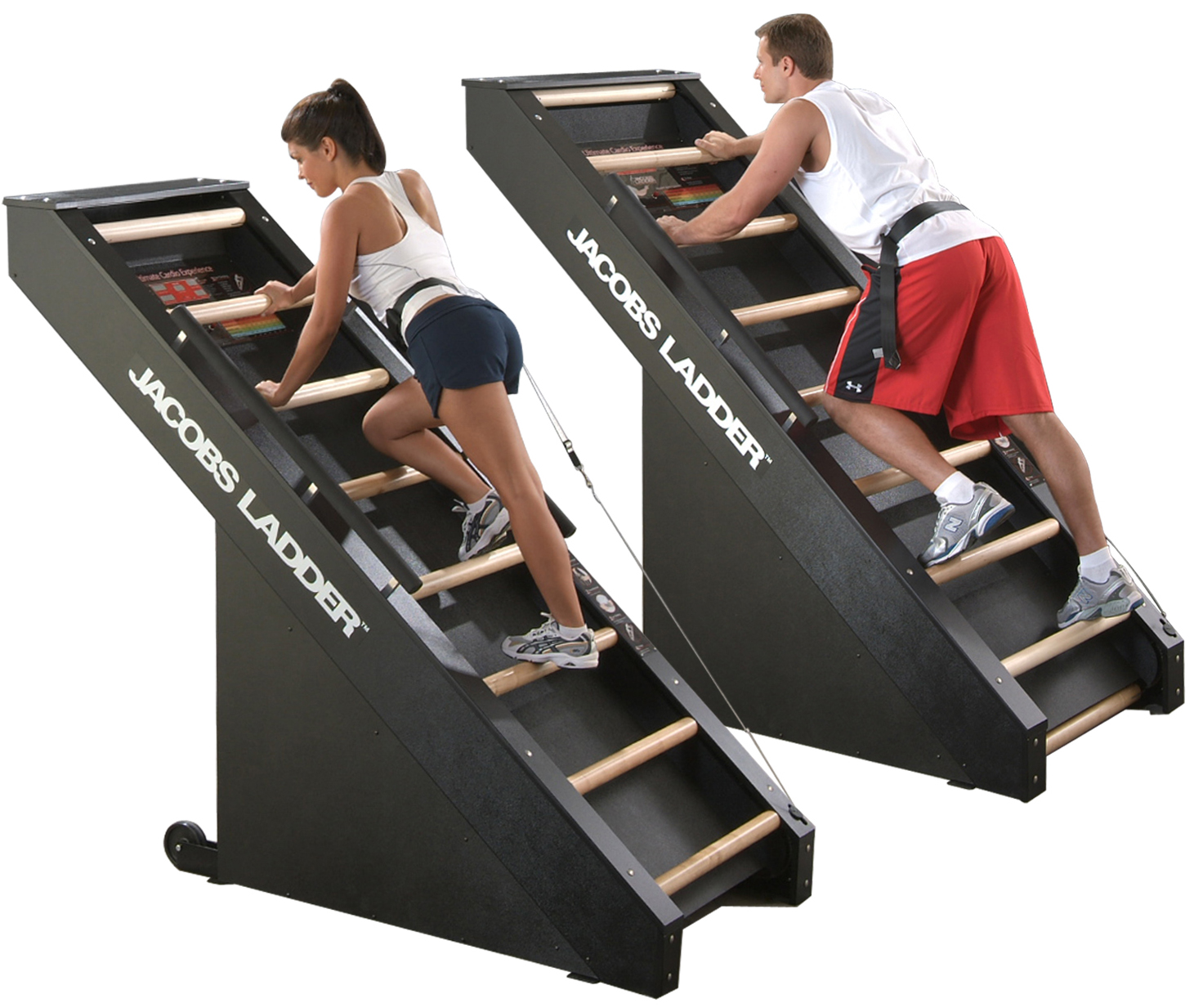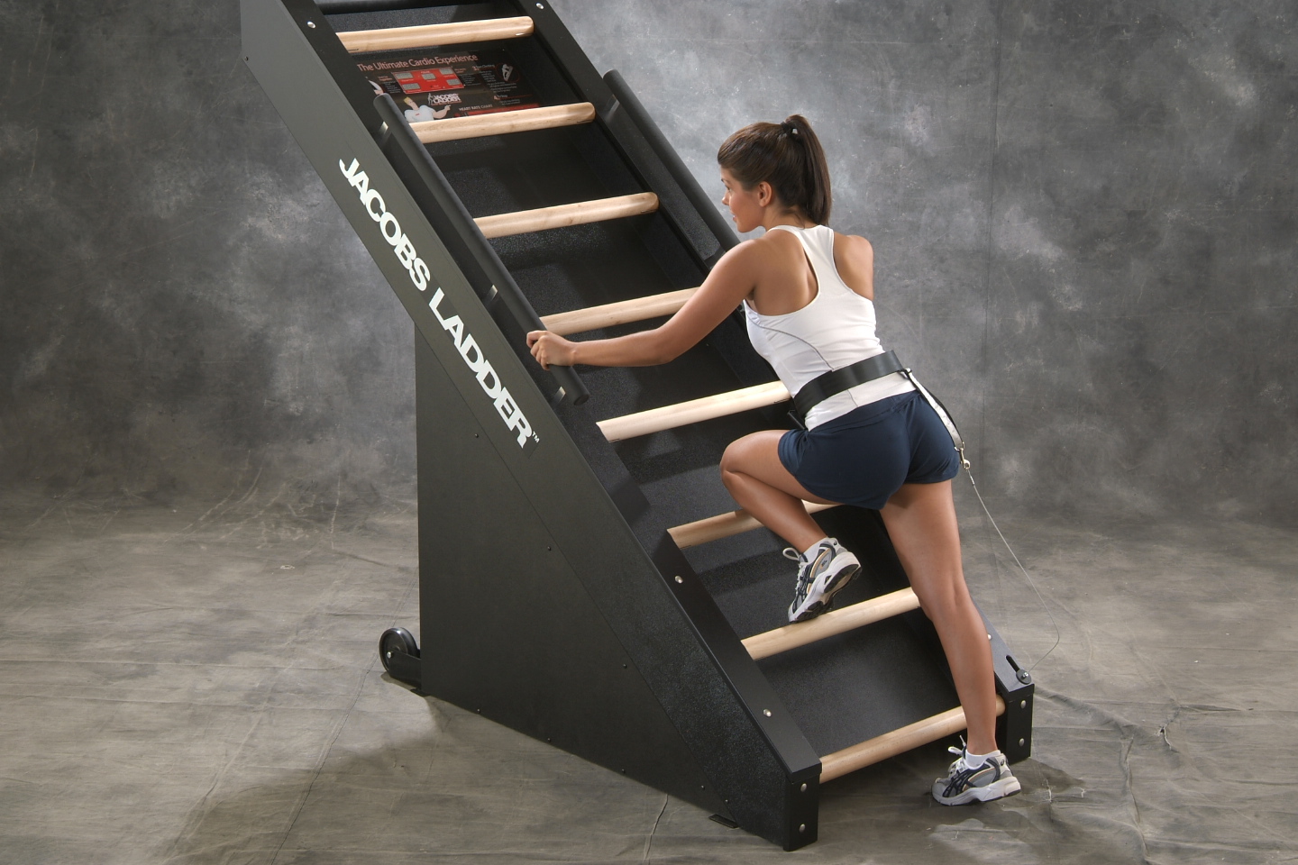 Тренажер лестничного типа и степпер сравнимы по эффективности и оба имитируют восхождение. И тот, и другой тренажер позволяют повышать нагрузку. Лестница Jacobs Ladder не имеет ограничения скорости, что позволяет использовать ее для повышения аэробной и анаэробной способностей. На Jacobs Ladder тело пользователя расположено под углом 40°, что позволяет разгрузить нижнюю часть спины и колени. Постоянная длина шага на тренажере лестничного типа составляет 30,5 см, а у степпера – 20,3 см, поэтому на Jacobs Ladder повышается нагрузка в конце цикла, а амплитуда движения более полная. Кроме того, этот тренажер позволяет прорабатывать мышцы верхней и нижней части тела.