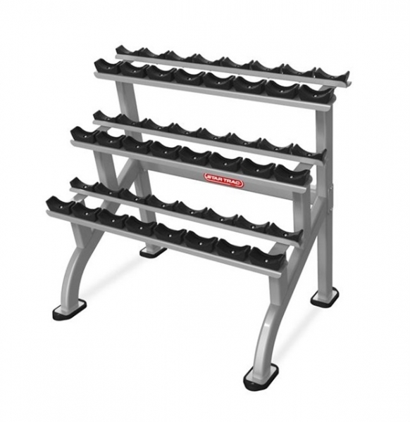 - Стойка имеет трехъярусную конструкцию с горизонтальными держателями, на которых можно разместить 12 пар гантелей.