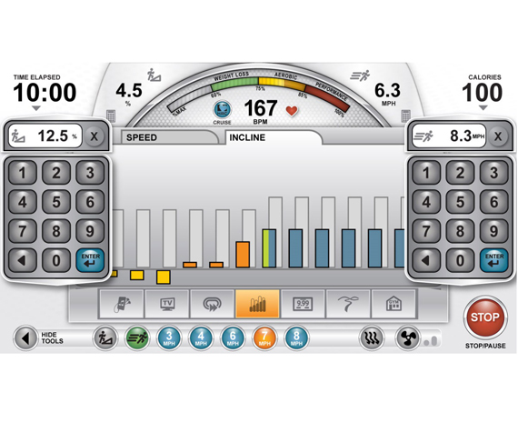 Данная модель имеет простую и понятную в управлении многофункциональную консоль Transcend16, оснащенную 16-дюймовым сенсорным дисплеем с дополнительным LCD экраном. На дисплее четко отображаются все тренировочные параметры. Сервисные возможности консоли расширены возможностью проводить самодиагностику и осуществлять через USB обновления системы. Высокая эффективность и разнообразие тренировок обеспечивается за счет обширного программного пакета. Контроль состояния сердечнососудистой системы в каждый момент времени осуществляется с помощью системы контроля пульса, которая включает в себя беспроводной кардиодатчик и сенсоры, встроенные в рукояти велотренажера.