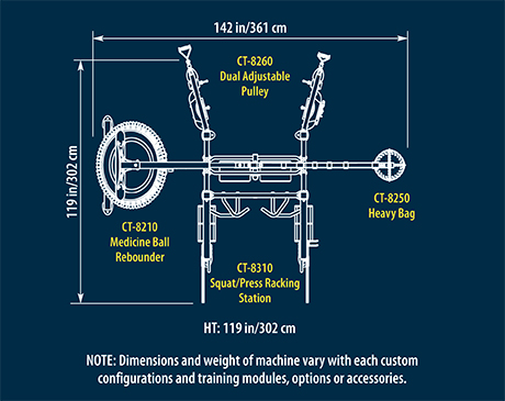 К основной конструкции системы предлагается метбол СТ-8210, батут, двойная регулируемая тяга СТ-8260, станция для присяда и жима и боксерская груша СТ-8250.