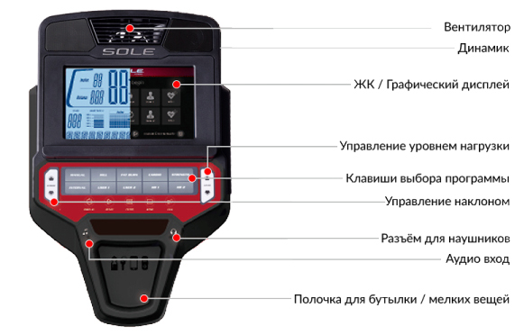 В многофункциональной консоли есть максимум опций для комфорта тренировок. Она оборудована полкой для хранения мобильных аксессуаров и других личных вещей, встроенным вентилятором, большим информативным дисплеем, аудио портом и гнездом для наушников, а также интегрированной акустической системой.