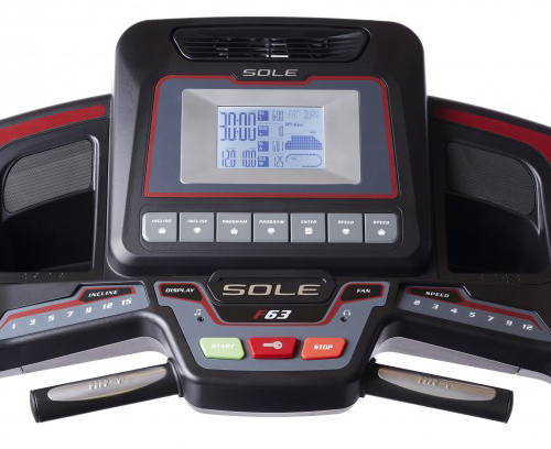 В оснащение беговой дорожки F63 (2016) от компании Sole Fitness входит консоль с информативным ЖК-дисплеем, имеющим высокое разрешение. Дисплей с интуитивно понятным интерфейсом имеет мягкую голубую подсветку и обеспечивает максимально информативное отображение всех тренировочных параметров.