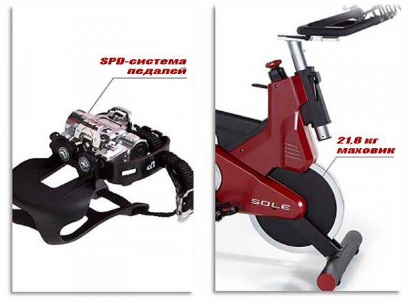 Спин-байк SB900 бренда Sole Fitness оборудован усиленными педалями SPD, которые можно использовать с клипсой (toeclip) или без клипсы (clipless).