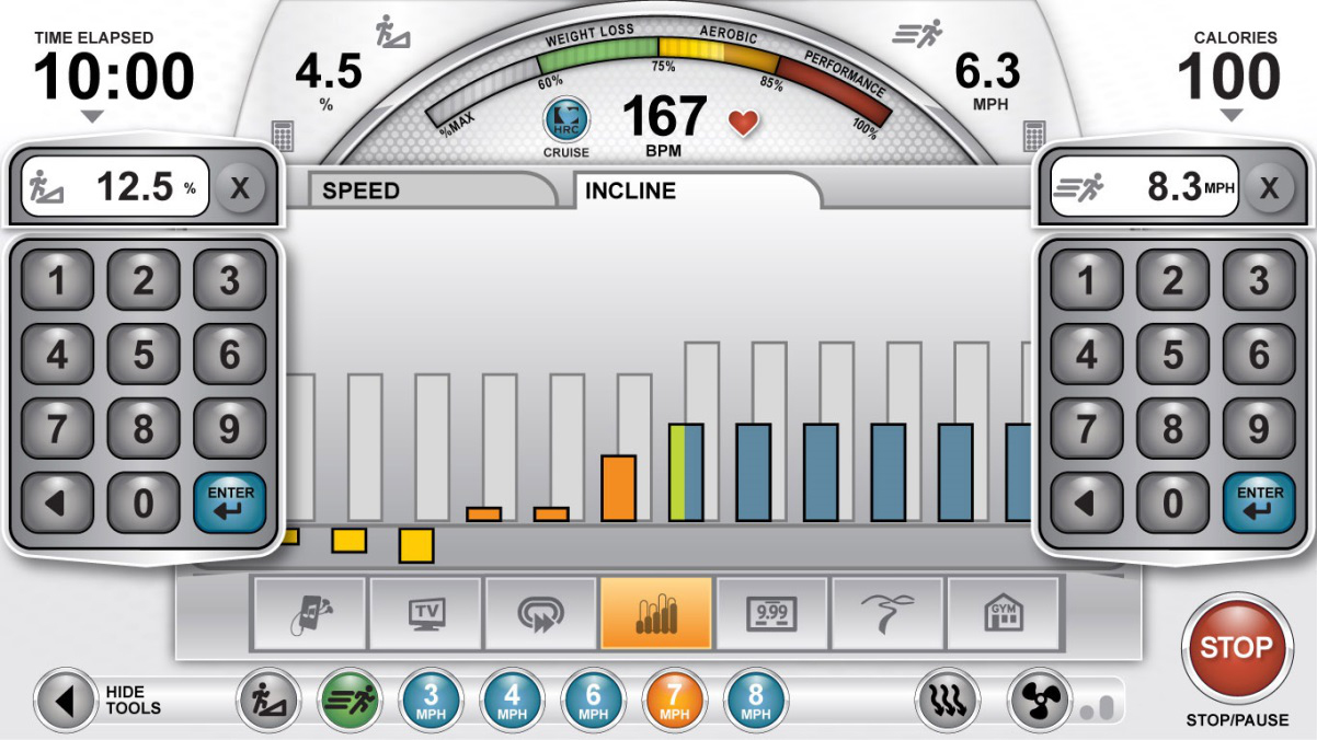 Данная модель имеет простую и понятную в управлении многофункциональную консоль Transcend16, оснащенную 16-дюймовым сенсорным дисплеем с дополнительным LCD экраном. На дисплее четко отображаются все тренировочные параметры. Сервисные возможности консоли расширены возможностью проводить самодиагностику и осуществлять через USB-порт системные обновления. Функция энергосбережения имеет три режима. Высокая эффективность и разнообразие тренировок обеспечивается за счет обширного программного пакета. Контроль состояния сердечнососудистой системы в каждый момент времени осуществляется с помощью системы контроля пульса, которая включает в себя беспроводной кардиодатчик и сенсоры, встроенные в рукояти велотренажера.